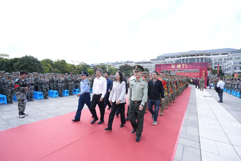 学校党委副书记、校长丁文丽出席仪式,区人武部上校政委王涛主持。辖区6所高校、滇中新区、经开区武装部负责人、12个街道负责人,接兵部队代表,新兵家长,军训新生4000余人参加了新兵出征仪式。