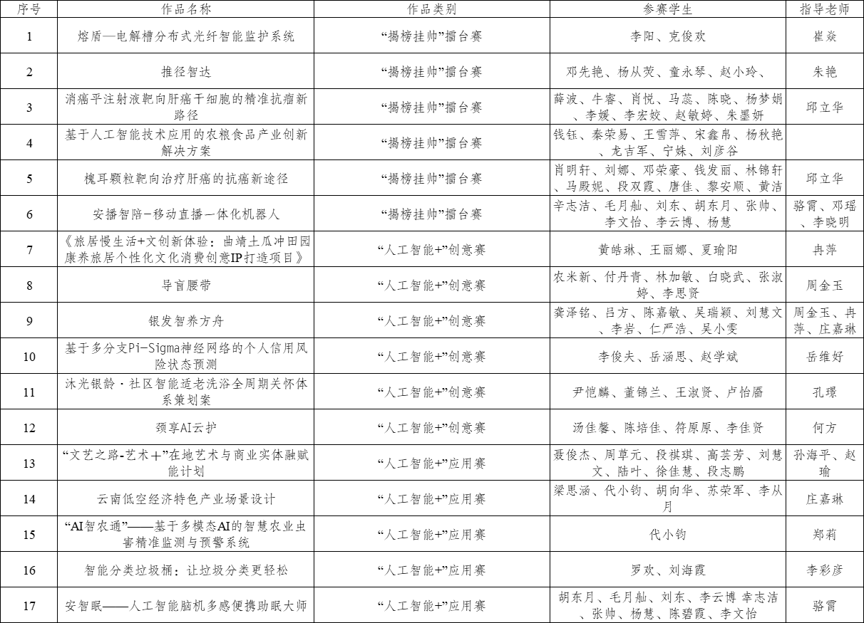 为全面落实科教兴国战略、人才强国战略、创新驱动发展战略,充分激发永利官网青年学子创新潜能与创造活力,推动理论知识与实践应用深度融合。yl23411永利集团官网于2025年6月-7月积极动员青年学子报名参加2025年“挑战杯”全国大学生课外学术科技作品竞赛“人工智能+”专项赛和“揭榜挂帅”擂台赛,经过遴选最终确定推报6个项目参加“揭榜挂帅”擂台赛,推报11个项目参加“人工智能+”专项赛,现将参赛作品情况予以公示。