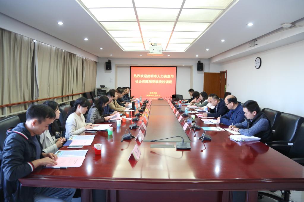 11月24日,昆明市人力资源和社会保障局局长唐琪,副局长郭加强、赵云川、赵磊、鲁朝凤及相关处室负责人一行11人到学校调研指导工作。学校校长丁文丽、副校长郭华参加调研座谈会。会议由郭华副校长主持。