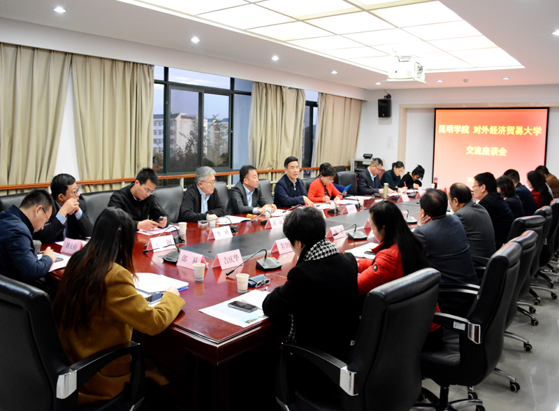 12月2日下午,对外经济贸易大学党委书记蒋庆哲,党委委员、副校长王敬波率国内合作办、组织部、党校办、团委、国家对外开放研究院、继续教育与远程教育学院等部门负责人一行到校交流指导工作。云南省委教育工委副书记陈世波、省委教育工委委员徐立、校院合作处处长朱金陵,学校党委书记陈永明、校长丁文丽在办公楼311会议室与来宾就两校合作事宜进行交流座谈。座谈会由丁文丽校长主持。