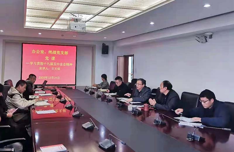 王文成副书记围绕党的十九届五中全会精神,紧扣习近平总书记在党的十九届五中全会上的重要讲话和全会审议通过的《建议》,从我国进入新发展阶段的重大意义、有利条件和重要特征,准确把握2035年远景目标和“十四五”时期我国发展的指导方针、主要目标、重点任务,牢牢把握构建新发展格局的战略构想和重要着力点,坚持党的全面领导,动员各方面力量为实现“十四五”规划和2035年远景目标而团结奋斗等四个方面,进行了深入解读和精辟阐释。并结合支部党员思想和办公室、统战部的工作实际,对办公室、统战部在新时期的工作提出了殷切的希望和要求。
