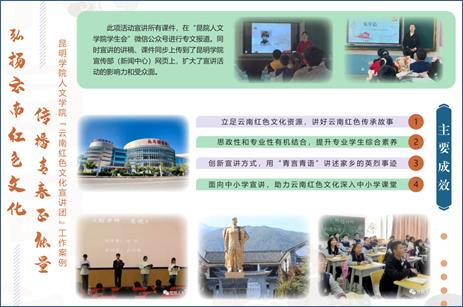 学院坚持党对学院事业的全面领导,全面贯彻党的教育方针,坚持为党育人、为国育才,落实立德树人根本任务,结合汉语言文学、历史学专业优势,创新“党建+红色文化”思政育人模式,组织师生开展“学习时代楷模· 张桂梅”——师生原创诗词作品展演活动,蕴养师德情怀,夯实德才兼备专业素质。组建“云南红色文化师生宣讲团”,赴中小学开展云南红色文化宣讲,弘扬云南红色文化,传播青春正能量。