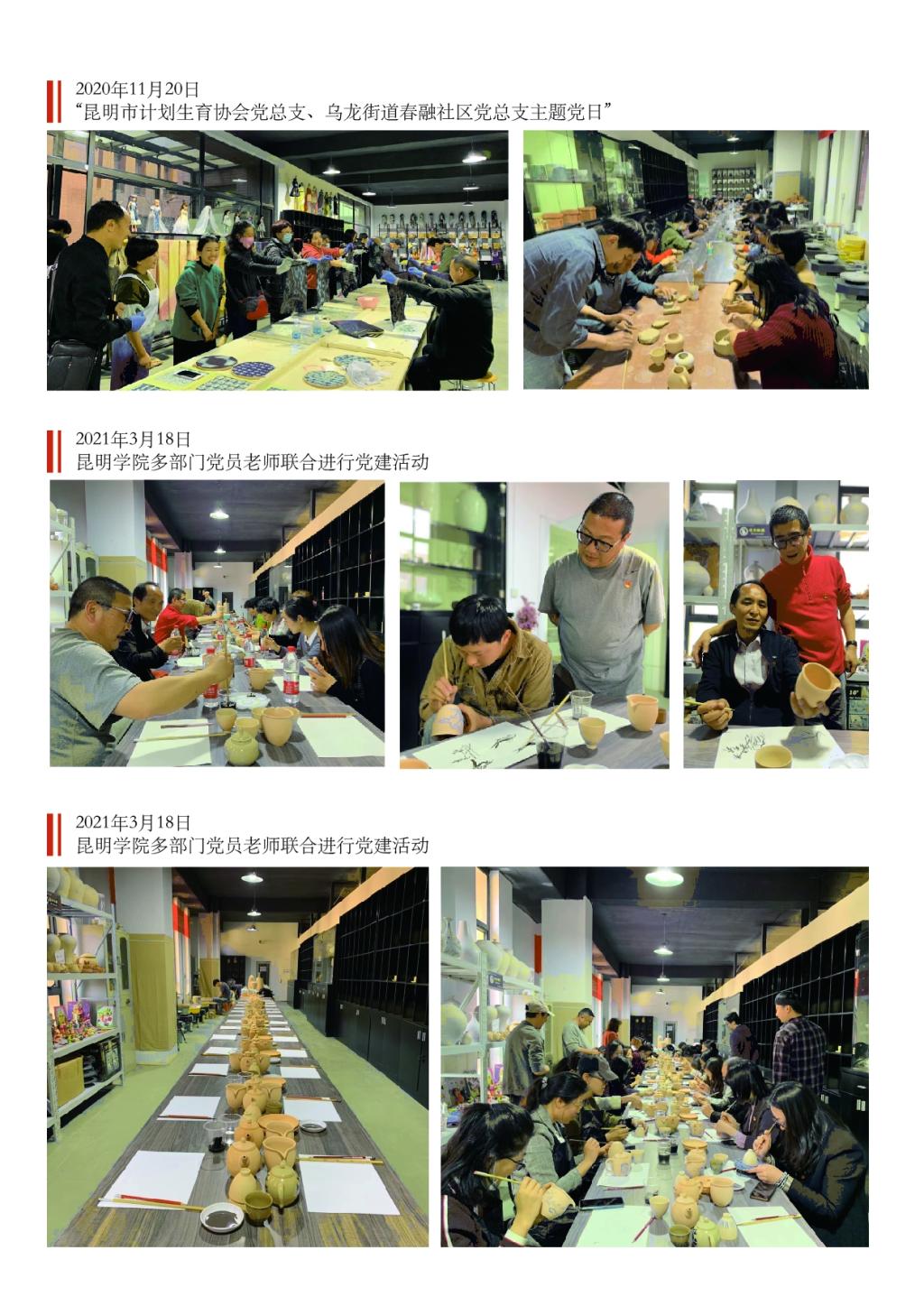 学院党建、教学科研工作与社会服务、文化传承同向发力、互促共进。一是组织师生党员到宜良县宜路陆游击大队纪念馆开展“感受红色情怀·追忆革命精神”学党史主题党日活动,到寻甸县红军长征柯渡纪念馆开展“寻访红色足迹 传承长征精神”主题党日活动暨“廉政主题党日”系列活动。在对宜良、寻甸几个特色乡村进行实地考察期间,承接产品包装开发、纪录片拍摄两项任务,确定两村村庄产业规划等乡村振兴合作意向。学生三支部与东川区阿旺镇关中村开展校地联合党建活动,制定乡村振兴行动计划。二是推进和顺通社区党委、地方政府的项目合作,推进党建品牌建设,主动融入云南文旅产品开发,共绘制完成乡村振兴墙画和产业规划图。三是通过社会实践提升就业质量。以文化传承为主的自主创业和高质量就业,使优秀文化得以代际传承。四是利用“紫云青鸟党建共建平台”深入开展社区服务,三年内共开展“主题党日”“支部活动”“党建示范基地民族民间工艺训练营”“云南省新时代文明实践社科普及志愿服务”等200余场次,直接服务党员群众学生6000余人,成为学院一张靓丽名片。