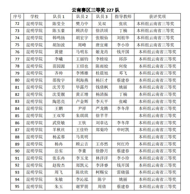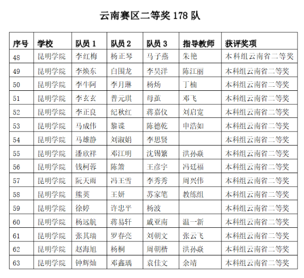此次竞赛于9月15日举行,云南省共31所高校组队参赛,经过国家、省两级专家的评审,全省共评出国家级一等奖3项、二等奖27项;云南赛区省级一等奖 139项、二等奖178项、三等奖227项。永利官网共组织129个本科队参加竞赛,50个队获奖,分别是全国二等奖1项(信息工程学院),省级一等奖9项(信息工程学院6项、数学学院2项、经济管理学院1项),省级二等奖16项(信息工程学院7项、数学学院6项、经济管理学院2项、物理科学与技术学院1项),省级三等奖24项(信息工程学院16项、数学学院6项、物理科学与技术学院2项)。