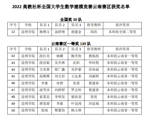 近日,云南省大学生数学建模竞赛组委会发文公布了“2022高教社杯全国大学生数学建模竞赛”获奖名单,永利官网参赛的129支队伍中有50支队伍获奖,其中,信息工程学院杨文博、汤淑艳、胡建金三位同学在邱莎老师指导下获得全国二等奖。