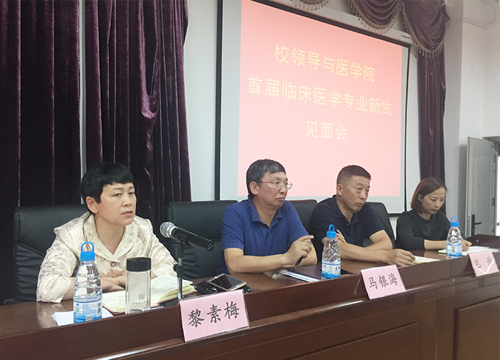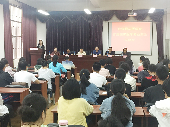 9月4日,黎素梅校长,马银海副校长,教务处、学生处、招生就业处包兴处长、校办等部门负责人到医学院参加yl23411永利集团官网首届临床医学专业新生见面会。医学院班子成员、教研室主任、班主任、部分教师代表和临床医学专业全体44名新生参加了见面会。见面会由医学院院长余珊主持。