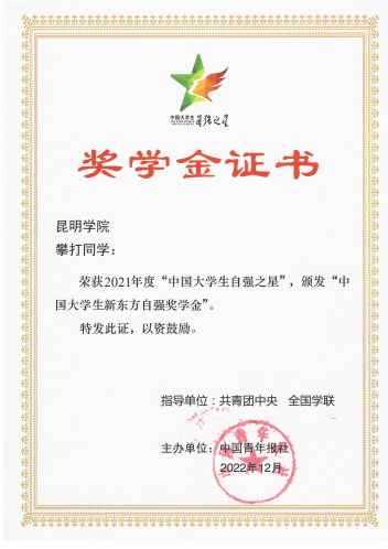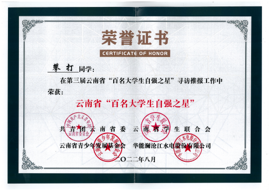 让青春在边境线绽放光彩。永利官网数学学院2021级数学与应用数学专业学生攀打,利用寒假社会实践机会,积极投身到家乡抗击疫情最前沿,于2021年12月至2022年2月,自愿到云南西双版纳勐海县边境戍边,与勐海县西定乡南览河护边民兵共同守边,用脚步丈量边境线,守护南览河沿岸的每一寸国土。因在社会实践期间表现突出,攀打经推荐参加第三届 云南省“百名大学生自强之星”评选,经层层选拔,于2022年8月获评为第三届 云南省“百名大学生自强之星”,2022年12月荣获“中国大学生自强之星”荣誉称号。