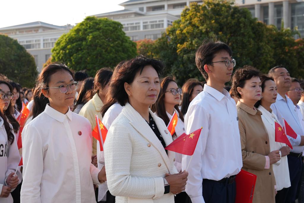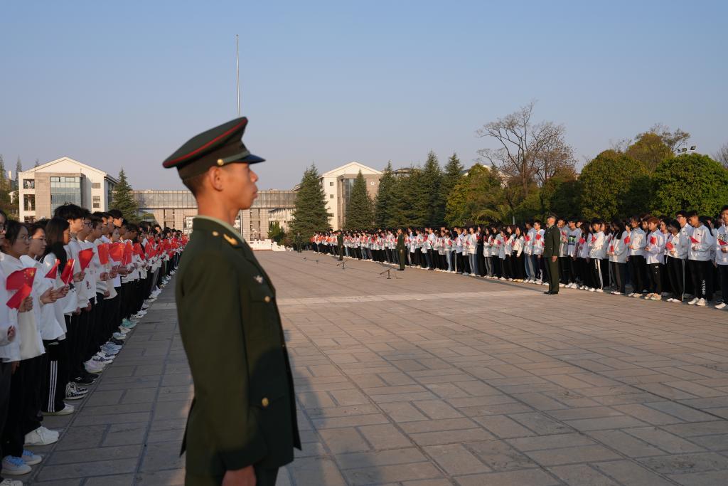 朝阳初升,师生们共聚聂耳广场。国旗班的同学们精神抖擞,迈着整齐划一的步伐走向升旗台。在高声齐唱的国歌声中,五星红旗冉冉升起,迎风飘扬,全场肃立,向五星红旗行注目礼。