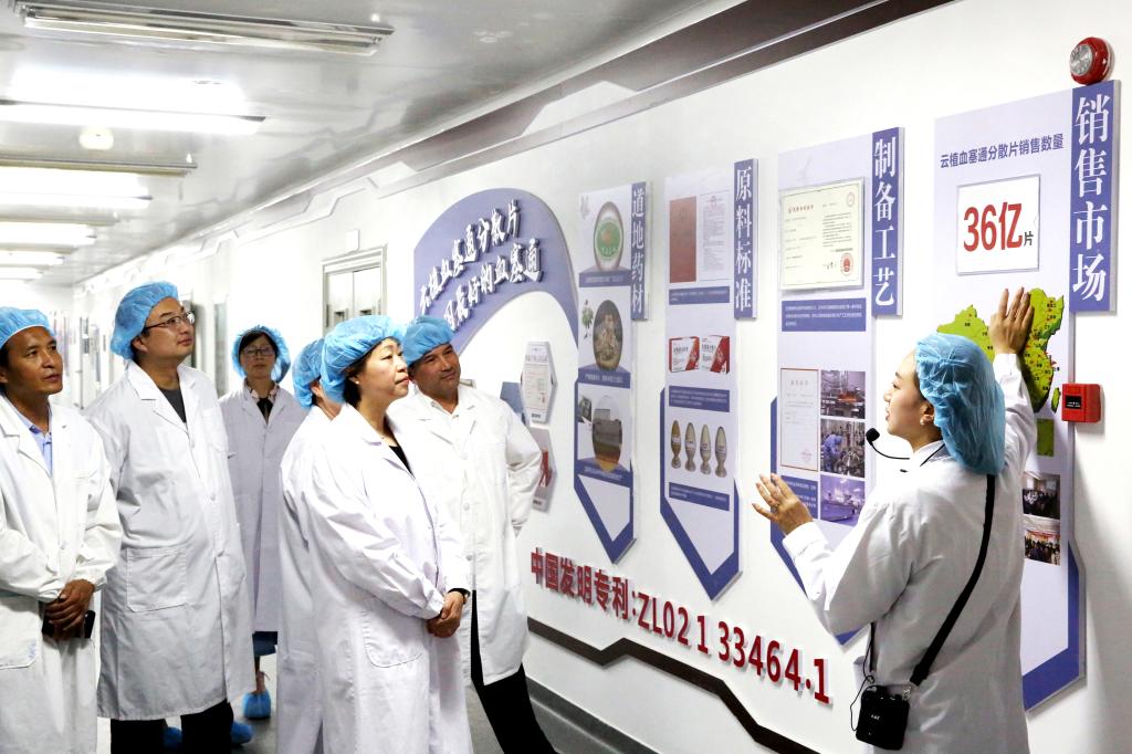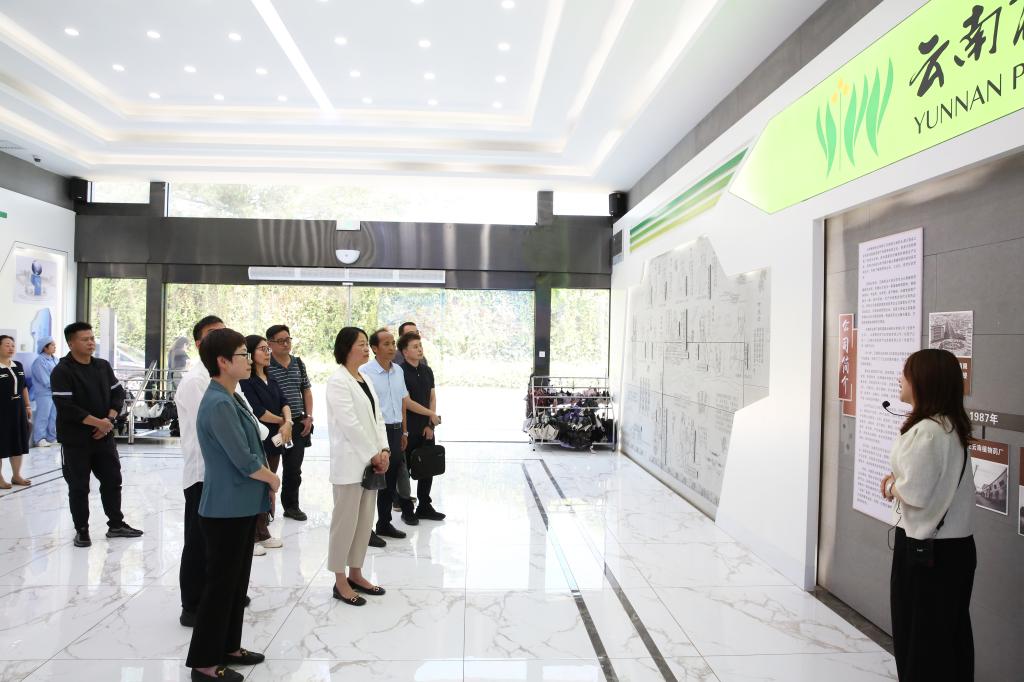 丁文丽一行首先来到云南省植物药业有限公司,在高新区管委会企业综合服务部部长林时票,云南植物药业有限公司党委副书记、工会主席蒋庆的陪同下,参观调研了公司的发展历程、企业文化、生产工艺、产品研发、人才培养等方面的情况。