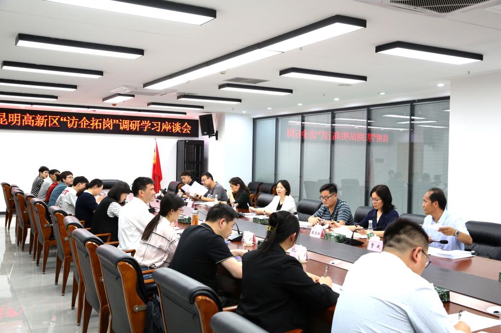 之后,丁文丽一行与高新区管委会有关部门负责同志,云南植物药业有限公司、云南雷允上理想药业有限公司、云南生物制药有限公司、云南圣科药业有限公司、云南杏林堂生物科技有限公司等辖区企业代表进行座谈,围绕云南生物医药行业的发展形势、用人需求、人才培养进行了交流,听取了企业对学校人才培养的意见建议,并就政校企开展产学研深度合作、科技项目攻关、专利成果转化、产业学院建设、人才培养、毕业生实习实践和校园招聘等交换了意见。