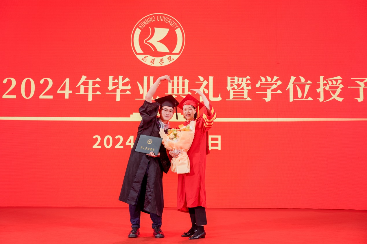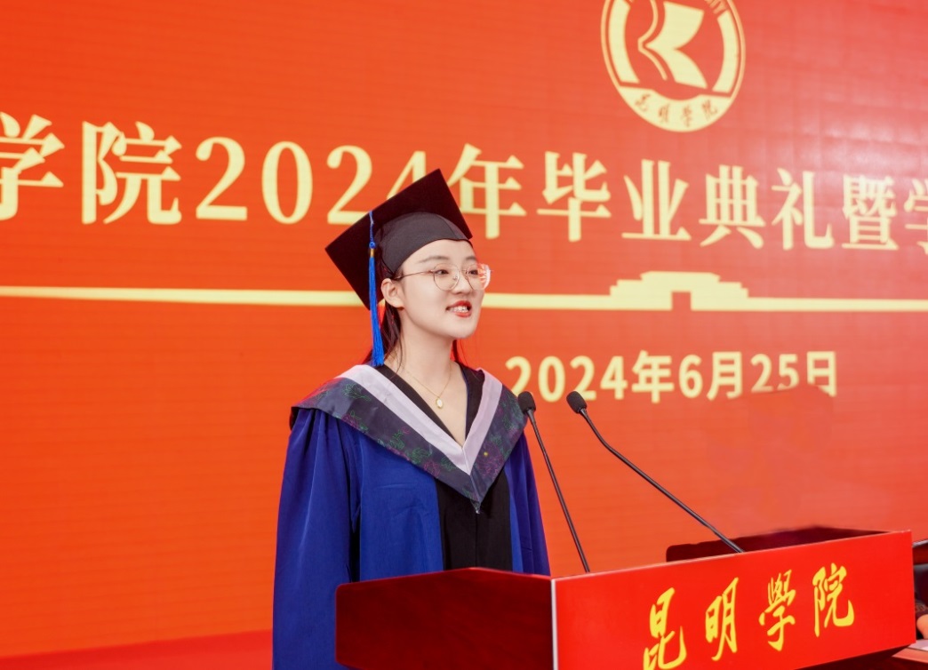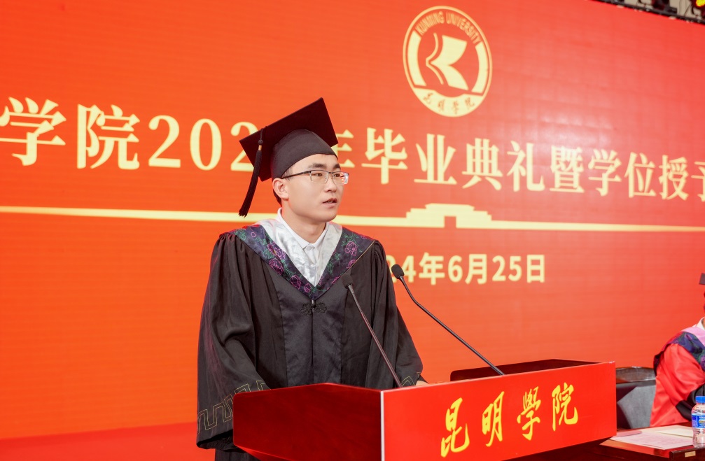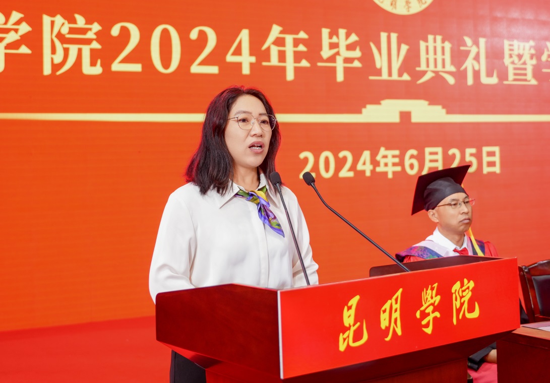 金幼和书记致辞,代表学校向2024届全体毕业生表示热烈祝贺,向一直以来辛勤耕耘、为同学们的成长成才付出心血汗水的老师们表示衷心的感谢。金幼和表示,四年前,同学们怀着梦想和激情从祖国四面八方来到yl23411永利集团官网,与祖国同频共振奔跑逐梦,共同见证了中国共产党百年华诞的光荣时刻,见证了第一个百年目标顺利实现,见证了党的二十大吹响奋进新征程的时代号角。一同亲历了脱贫攻坚千年梦圆、全面建成小康社会、全面开启中国式现代化新征程的重要历史时刻。大学四年,同学们与学校同心同行,我们共同迎接学校第二次党代会胜利召开,共绘学校“十四五”高质量发展的锦绣蓝图,共担“更名大学”的历史使命,共谱“教育高质量发展三年行动”新篇,共创第九届“互联网+”大学生创新创业大赛的优异成绩,同学们以青春之光为昆院添彩,昆院以高质量发展为同学们赋能,师生共赴“建设特色鲜明的综合性应用型高水平大学”新征程,收获了成长、责任和担当,也证明了自己有潜力担当大任、掌握未来。