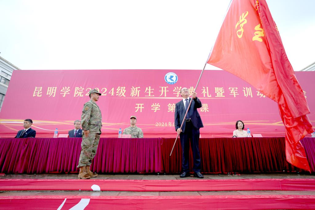 学校党委书记金幼和,党委副书记、校长丁文丽,官渡区人民武装部副部长杨鹏,校领导李莉、王文成、彭志远、王凡、李剀、罗荣辉出席典礼。党委委员、副校长彭志远主持。学校各二级学院党政主要负责人、副书记,新生辅导员、班主任,职能部门负责人参加。