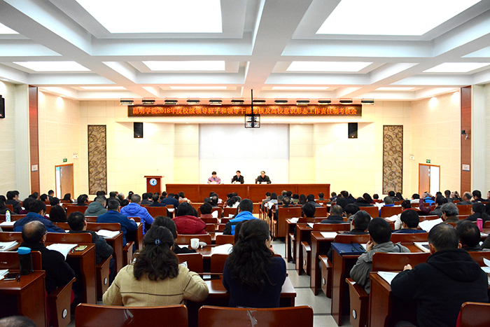1月16日,按照省委的安排部署,以省教育厅巡视员陶晴为带队领导,以云南师范大学党委副书记张玮为组长的省委高校工委第九考核组到校开展2018年度领导班子、领导干部考核及高校意识形态工作责任制考核,并开展省管单位选人用人 “一报告两评议”工作。考核组织组长张玮作动员讲话,学校党委书记陈永明汇报工作,校长黎素梅主持会议。学校全体校领导,近三年退休的校级领导,全体中层干部,基层党员干部职工代表参加考核会议。
