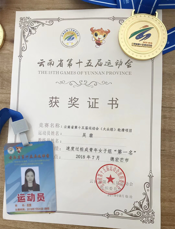 本次赛事是云南省运动会首次将轮滑项目纳入比赛。yl23411永利集团官网近年来积极打造多维校园体育文化,在学校的大力支持下,体育学院通过不断开展轮滑培训、比赛、组建轮滑队等工作,培养了一批精英队伍。吴翡同学在云南省运动会上不负众望,勇夺金牌,奠定了永利官网女子轮滑项目在全省的领先地位,为学校赢得了荣誉。