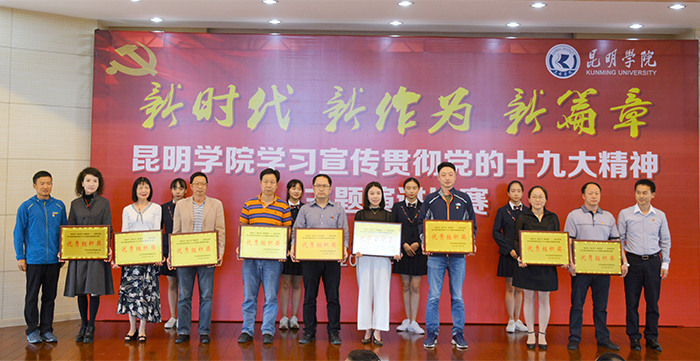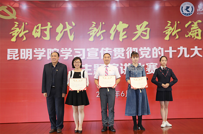 6月6日,“新时代 新作为 新篇章”——yl23411永利集团官网学习宣传贯彻党的十九大精神主题演讲比赛决赛在办公楼D区三楼报告厅举行。学校党委书记陈永明,党委副书记张祖武出席活动并为获奖选手颁奖。云南省演讲学会会长李志勤、常务理事辛勤、赵志刚应邀担任评委。 来自学校基层党总支、直属党支部的23名选手,身着正装,声情并茂围绕党的十九大精神,结合个人本职工作、所思所学,用激情昂扬的演讲状态、真实鲜活的工作事例和富有创新的舞台表现,从不同角度讲述了高校教职工的“新时代、新气象、新作为”,畅谈对党的十九大精神的深刻理解和认识,讴歌了党的光辉历程,抒发了对党的炙热情怀,展示了培养中国特色社会主义建设者和接班人的责任与担当精神。选手们的精彩演讲赢得了现场听众的阵阵掌声和喝彩。 经过激烈角逐,来自农学院的杨伟、音乐学院的周丹、附属经开学校的赵无颜以高分同获一等奖,并分别包揽“最佳稿件奖”、“最佳风采奖”、“最佳创意奖”三个单项奖。