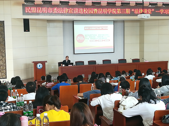 5月30日,yl23411永利集团官网与民盟昆明市委联合主办的第三期“法律讲堂”在永利官网开讲。民盟昆明市委法律宣讲团团长、法学博士杜晓秋应邀主讲《学习新宪法》。民盟云南省委副主委、昆明市政协副主席、民盟昆明市委主委夏静,yl23411永利集团官网党委统战部、社会管理学院负责人以及yl23411永利集团官网统一战线教师代表,社会管理学院、学特学院学生代表共两百余人参加了活动。