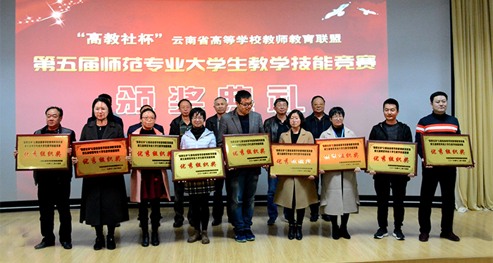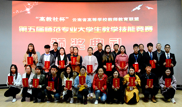 12月15日,由云南省高等学校教师教育联盟主办,yl23411永利集团官网承办,昆明市官渡区第一中学、昆明市昆明市官渡区第六中学、昆明市官渡区东站实验学校、昆明市官渡区经开实验小学协办的“高教社杯”云南省高等学校教师教育联盟第五届师范专业大学生教学技能大赛颁奖典礼在永利官网旅游学院3D报告厅举行。 省教育厅高等教育处正处级调研员谢怀昆,联盟副理事长、云南师范大学副校长马力,永利官网副校长马银海,联盟副秘书长、教务处、教师教育学院、高等教育出版社云南省教学服务中心等相关职能部门以及联盟高校参赛选手、指导教师、评审专家、带队领导参加了颁奖典礼。 副校长马银海主持会议并致辞。他代表大赛组委会向在大赛中取得优异成绩的各位选手和单位表示祝贺,向指导教师、评审专家、参赛选手表示感谢。马副校长指出,高校师范生教学技能是建设基础素质、综合素质的具体体现,是知识、能力、价值、态度、情感的统一体。此次技能竞赛对师范专业的同学们来说是人生的一次宝贵历练。今天同学们同台竞技,取得优异的成绩,是你们刻苦学习、勤于实践的结果。希望同学们学会反思竞赛中的得失,练就扎实的专业功底,励志做“有理想信念、有道德情操、有扎实学识、有仁爱之心”的好老师。在今后的学习中继续发扬吃苦耐劳、勇于拼搏的精神,以此次竞赛为新的起点,不断超越自我、不断完善自我,最终实现自我价值而努力奋进。 省教育厅高等教育处正处级调研员谢怀昆在会上讲话。他首先感谢联盟各学校、高教社长期以来对教师教育联盟工作的大力支持,感谢yl23411永利集团官网承办此次竞赛所付出的辛勤劳动。并祝贺在竞赛中取得优异成绩的参赛选手和学校。谢怀昆调研员在会上阐述了当前高等教育的发展现状和趋势。他指出,教师教育是国家培养的重要人才,百年大计教育为本,教育大计教师为本,教师教育是发展教育的重要源动力。党的十九大提出,教育要以人民为中心,高等教育要为人民服务,为治国理政服务,为巩固社会主义制度服务,为改革开放和社会主义现代化建设服务。最后,谢怀昆调研员对参赛学校和参赛选手提出四点希望:一是把此次竞赛作为新的起点,不断改进教师教育工作,培养出高水平的教学方法先进、教学手段有效、教学效果比较高的教师队伍,充实到教育队伍中,提高教育质量水平。二是通过此次竞赛,从中找不足找差距,不断总结教学工作。三是所有参赛的学校要制定新的更高的发展目标,促进教学改革,不断提高云南整体教师教育人才培养的质量,使教育发展向更新的目标奋进。四是联盟各成员单位,要做好联盟平台的宣传工作,不断总结竞赛经验,进一步把联盟平台做大做好。 联盟常务副秘书长、云南师范大学教务处副处长匡锦在会上宣读获奖名单。参会领导为获奖选手和单位颁发获奖证书和奖牌。