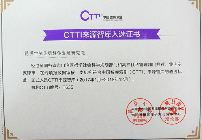 经相关单位推荐、CTTI系统填报、专家团评审等程序,昆明科学发展研究院从3000多家研究机构中脱颖而出,正式成为CTTI来源智库新增补的100余家高校智库之一,也是云南省唯一入选CTTI来源智库的地方本科高校智库。 12月20日,南京大学、光明日报社共同举办的“2017中国智库治理暨思想理论传播高峰论坛”在京举行。昆明科学发展研究院吴瑛院长、沈艳萍副院长应邀参加论坛,并领取了入选证书。昆明科学发展研究院正式成为CTTI来源智库,标志着yl23411永利集团官网智库建设又上了一个台阶,智库服务地方经济社会的能力正在不断提高,同时也是云南省推进省院省校合作,yl23411永利集团官网与南京大学共同合作取得的成果之一。