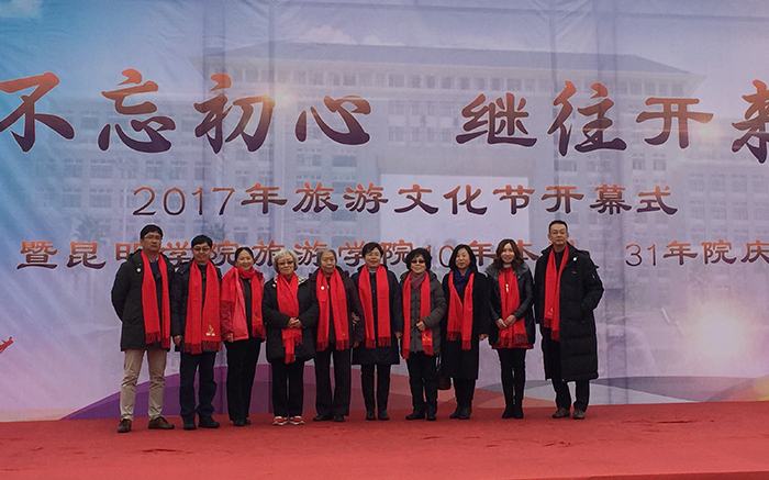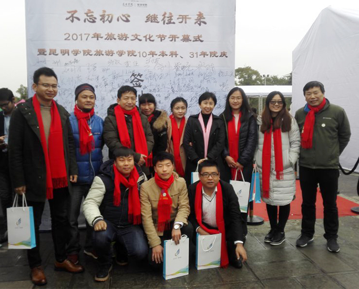 11月24日,旅游学院在永利官网聂耳广场举办了主题为“不忘初心、继往开来——2017旅游文化节暨yl23411永利集团官网旅游学院10年本科、31年院庆”的开幕庆典活动。 出席开幕式的有永利官网副校长熊晶,历届老领导,校企合作专场招聘会40余家代表,历届校友400余名、在校学子500余名共襄盛举。本次活动由2000级校友现任云南交通之声主播罗西主持。 开幕式上,熊晶副校长代表学校致辞,并向各位来宾介绍了yl23411永利集团官网近几年的发展和旅游学院的情况。院长田芙蓉代表旅游学院全体师生欢迎校友们回家并表达了成立校友会的愿望,她相信在校友们的支持下,旅游学院在未来的征程中会取得更大的发展。 1995级学生代表朱江代表95级的校友向学院赠送礼物,感恩母校的教育之情。2003级的毕业生班先海、雷翔等校友表演了花式调酒。校友情、师生情感动着每一位在场的嘉宾。
