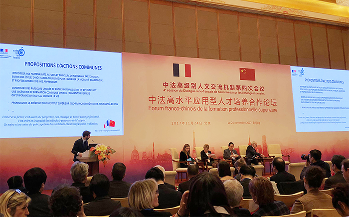 该论坛是中法高级别人文交流机制第四次会议的中央配套活动之一,由中国教育部和法国外交部共同主办,中国教育国际交流协会、法国驻华大使馆承办,旨在为深入推动中法两国人文交流,进一步拓宽交流领域、深化合作内容,促进中法教育领域务实合作。会议期间,中法两国领导人出席论坛并发表重要讲话。全国近35 所地方应用型高校的党政领导及相关部门负责人参加会议。来自法国41所大学、高中、职业高中、职业和资格园区的专家学者参加了此次论坛。