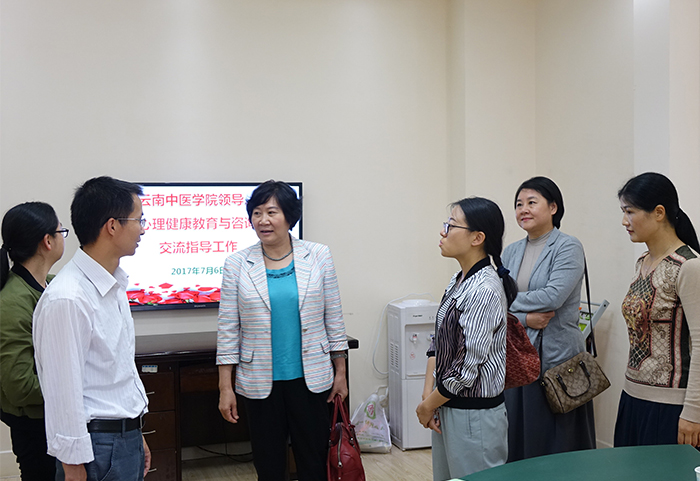 7月6日,云南中医学院党委纪委书记李媛芬率人文学院和学生处相关老师到永利官网心理健康教育与咨询中心(以下简称中心)交流指导工作,心理健康教育与咨询中心主任王荔、副主任徐惠萍等接待了李书记一行人。
