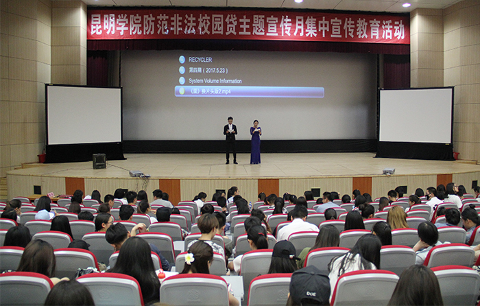 昆明市公安局经济文化保卫分局校园保卫处的杨淇警官来到现场,为大家以案释法。杨警官结合微电影中反映的校园网贷情况,列举多起全国和我省发生的涉及非法校园网贷的真实案例,为同学们深入剖析了非法校园网贷的危害,提出了防范非法校园网贷的指导意见,并与现场同学进行了互动交流,为同学们上一堂大学生信用安全教育课。