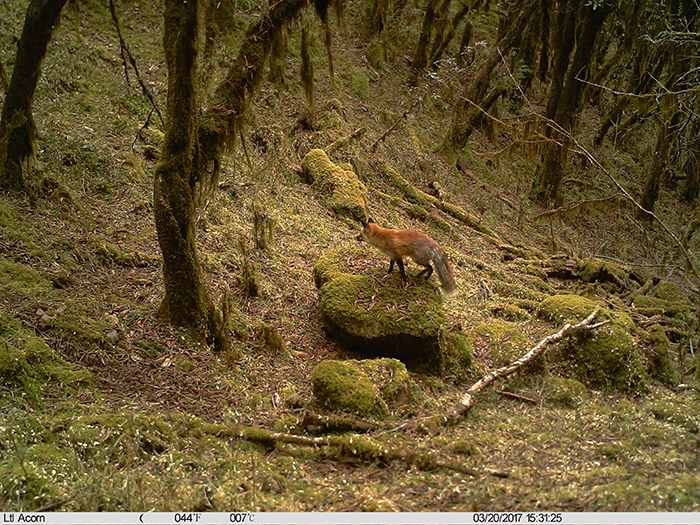 本次调查,还首次拍摄到赤狐(Vulpes vulpes)的照片。赤狐体长约80厘米,拥有发达的听觉与嗅觉,性狡猾,行动敏捷,喜欢单独活动。赤狐主要在夜晚捕食,主要以旱獭及鼠类为食。赤狐属中小型食肉目犬科动物,它的存在说明保护区内具有完整的生态链,推测应该有一个小种群,值得深入研究。本次考察的结果初步展示了作为“滇中第一山”之称的轿子山拥有丰富的生物多样性,值得深入调查研究。
