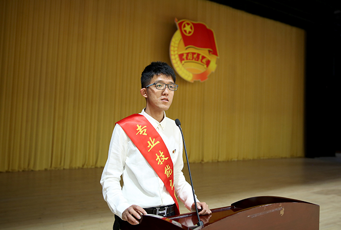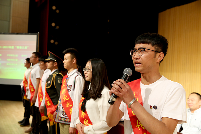 团员代表、专业技能之星王嘉曦同学发言。从专业学习、社会实践、创业创新等方面,分享了自己的学习成长经历。讲述了他在校期间美术作品获得国家级奖项8次、省级和校级奖项19次、留校收藏作品10幅,荣获了第十二届云南省大学生年度人物、连续三年获yl23411永利集团官网三好学生、2015年获得中国美术学院社会美术水平考试山水8级证书、2017年获国家奖学金等12项荣誉称号。同时他在大一学年就举办美术作品联展,四年来坚持手绘yl23411永利集团官网每一处风景的明信片,运用创新创业实践与同学共同开了淘宝店。他用自己的经历告诉我们要珍惜青春、努力学习、回报父母、奉献社会。