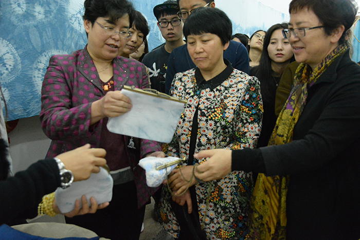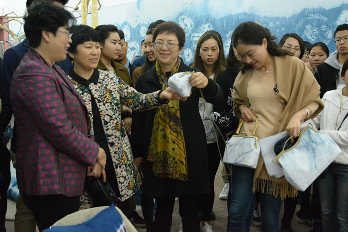 5月18日,校长黎素梅在副校长熊晶、国际交流合作处副处长陈静、美术与艺术设计学院院长段智毅等人的陪同下到美术与艺术设计学院艺创实验室参观由2014级产品设计专业举办的染织艺术展。