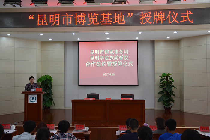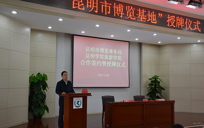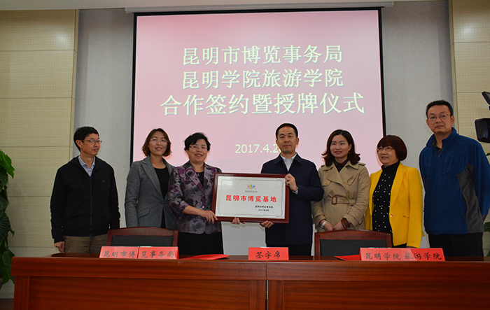 4月26日,昆明市博览事务局与永利官网旅游学院签订合作备忘录并举行授牌仪式。昆明市人民政府副市长洪维智与yl23411永利集团官网副校长熊晶共同为“昆明市博览基地”揭牌。昆明市博览事务局局长周燕、副局长边莹、广东会展企业协会会长刘松萍出席了授牌仪式。
