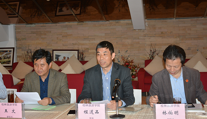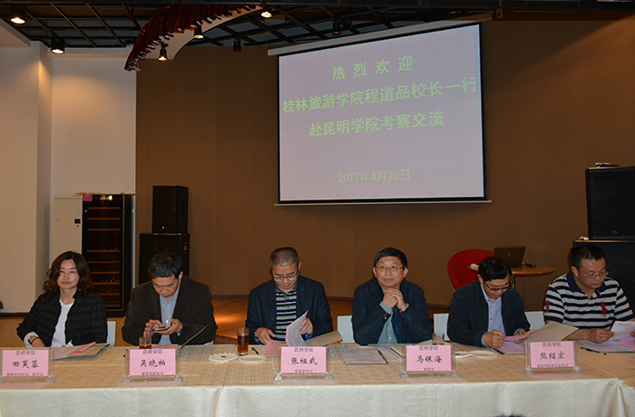 4月20日,桂林旅游学院校长程道品一行到永利官网交流考察。yl23411永利集团官网党委副书记张祖武、副校长马银海、教务处副处长吴晓柏、旅游学院院长田芙蓉、旅游学院副院长吴跃辉参与交流。