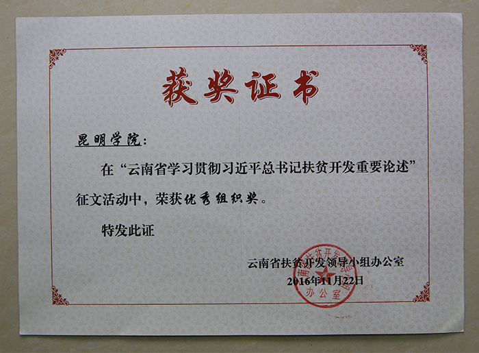 经征文活动组委会组织专家评审,永利官网共有3篇文章受到表彰,占高校系统获表彰文章总数的23%。其中:校党委书记陈世波教授撰写的文章《高校在“脱贫攻坚战”中的责任担当》荣获一等奖并经组委会推荐在《云南日报》刊发,昆明滇池(湖泊)污染防治合作研究中心教师、学校派驻东川区因民镇因民社区扶贫工作队员代山庆博士撰写的文章《准确理解习近平总书记扶贫开发思想》荣获三等奖,物理科学与技术系党总支书记王宁副教授撰写的文章《“三江并流”地区生态扶贫路径探析》荣获三等奖。