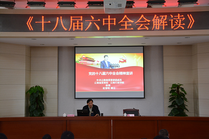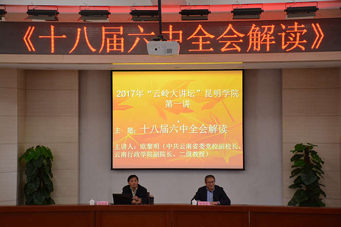 4月7日,由省委宣传部、省社科联主办,yl23411永利集团官网党委宣传部、机关党总支、昆明科学发展研究院共同承办的“云岭大讲坛﹒昆明讲坛(yl23411永利集团官网)”第一讲在yl23411永利集团官网开讲。云南省委党校副校长、云南行政学院副院长欧黎明教授应邀主讲《十八届六中全会解读》。学校党委副书记张祖武主持报告会。