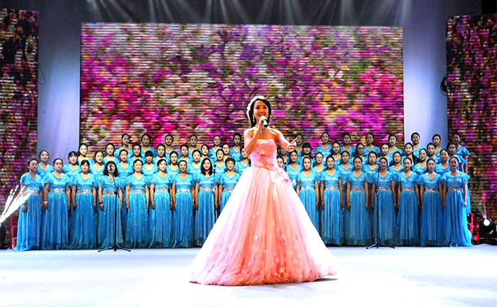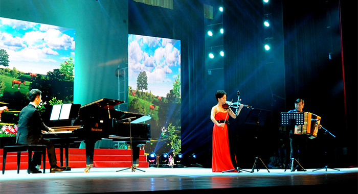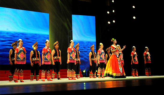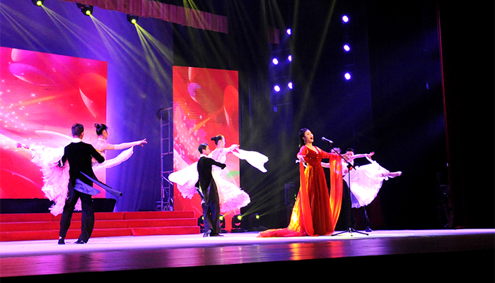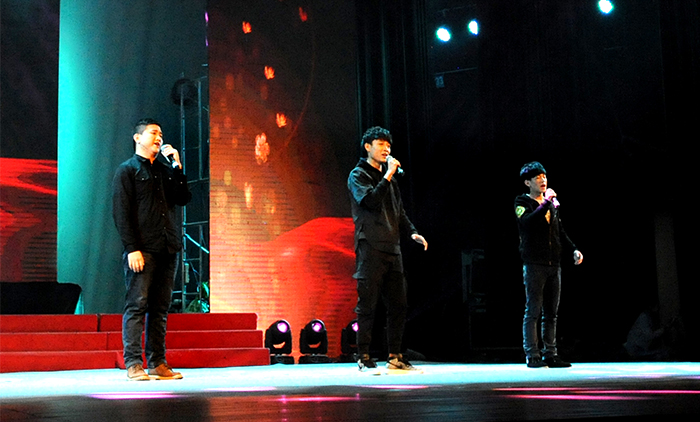 演出分为三个章节。其中,“白雪阳春•爱的交响”章节以展示永利官网教师风采为表现内容。由郭海波老师和yl23411永利集团官网女高知联合唱团、yl23411永利集团官网洋浦合唱团带来的《世纪春雨》展现了永利官网教职员工,神采奕奕、精神焕发的良好风貌。廖一瑄、袁瀚、周砚馨三位老师用手风琴、钢琴和小提琴,共同演绎了优美而富于激情的《春之歌》和《咆哮的风箱》歌曲,演奏中的互动配合,展现了乐器交汇的独特魅力。龚婷老师演唱的《春暖花开》优美动听,赢得了全场师生的阵阵掌声。王捷老师和体育学院体育舞蹈团呈现的《春之声圆舞曲》,以激情辽阔的歌声和妙曼多姿的舞步,唱响了青春的旋律,舞出了青春的活力。杨丽珠、李艳红、张新、王金强四位老师演绎的《节日欢歌》,优美动听,配合默契,让在场观众感受到了四重唱的独特魅力。