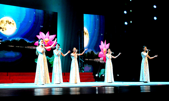 “春华秋实•创新展示”章节以校地联合、协同创新成果为表现内容。云南省第四届本土歌曲大赛一等奖作品大合唱《新大河涨水沙浪沙》旋律优美动听;何佳老师带来的女声独唱《梁王山下稻花香》感心动耳;龚婷老师和鲁林老师共同演绎的男女声二重唱《呈贡等你来》洋洋盈耳;张梦老师和乐尼玛依组合带来的《花语花香》温婉多情;鲁林老师带来的男声独唱《好美一座城》娓娓动听。