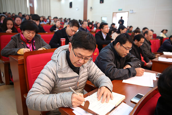 张祖武强调,在前一阶段三轮集中学习的基础上,学校进一步学习贯彻党的十八届六中全会精神,一要大力营造学习宣传贯彻党的十八届六中全会精神的浓厚氛围。全校各部门、各院系要按照中央、省委的统一部署,把学习宣传贯彻全会精神的工作摆在突出位置,精心组织、周密安排,引导全校广大党员、干部和师生把思想和行动统一到全会精神上来,把力量凝聚到实现全会确定的各项任务上来。要以今天的报告会为契机,再加力度、再加措施,再一次掀起学习宣传贯彻全会精神的热潮。注重发挥宣传主阵地作用,多角度、立体化解读全会精神,增强宣传的针对性和实效性,推动全会精神入脑入心、落地生根。二要把学习贯彻全会精神与落实省委巡视整改意见和学校第一次党代会确定的各项目标任务结合起来。全校各部门、各院系要把学习贯彻全会精神与落实学校第一次党代会确定的各项目标任务结合起来,做到两手抓、两促进,真正使学习过程成为统一思想、提升能力、破解难题的过程,把学习成效转化为促进学校改革发展的思路和举措,转化为解决学校转型发展迫切问题的新进展,转化为改进工作作风的新成效。把学习贯彻全会精神全面、具体融入到学校转型发展、内涵提升、重点突破,奋力建设综合性应用型高水平地方大学的各项工作中。三要要把学习宣传贯彻全会精神纳入“两学一做”学习教育。学校各部门、各院系要把学习宣传贯彻全会精神纳入“两学一做”学习教育,通盘考虑,统筹安排,扎实开展专题学习,力求学深悟透、入脑入心。学习要突出“关键少数”,领导干部要带头学习好、贯彻好,作好表率。通过以上率下、以学习促发展,坚定自信、保持定力、脚踏实地、真抓实干,坚定不移推进全面从严治党,加快学校改革发展,为实现高质量通过2018年教育部本科教学审核评估,实现硕士学位点和国家级奖励双突破,主要指标达到设置大学的条件,争取更名大学成功的近期目标而努力,以优异成绩迎接省第十次党代会和党的十九大胜利召开。