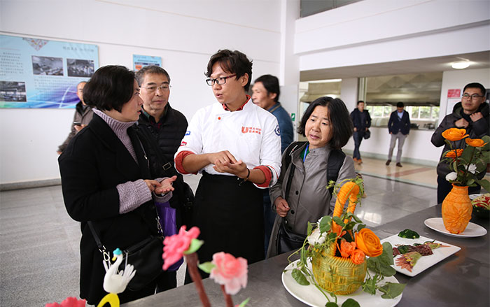 合作协议签字仪式后,来访代表一行在永利官网旅游学院院长田芙蓉、党总支书记熊绍宏等负责人的陪同下参观了校园环境建设,深入旅游学院烹饪实训中心、旅游酒水实验室等教学场所进行参观考察,与正在实训的学生进行热切交流,对学生实训作品进行评阅,并在作品前驻足留影。永利官网一流的教学设施、特色的餐饮教学赢得代表们赞不绝口,给予一致好评和高度赞誉。