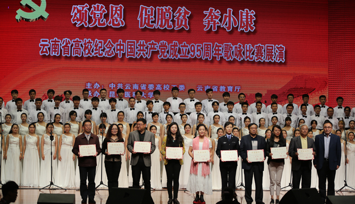 6月16日,由中共云南省委高校工委、云南省教育厅主办的云南省高校庆祝中国共产党成立95周年歌咏比赛展演活动在昆明医科大学呈贡校区学生会堂举行。云南省教育厅党组副书记、副厅长邹平,省委高校工委副书记陶晴,云南省文化厅副厅长王江红,共青团云南省委副书记赵国良,昆明医科大学校长李松,永利官网党委副书记孙勇出席展演活动。