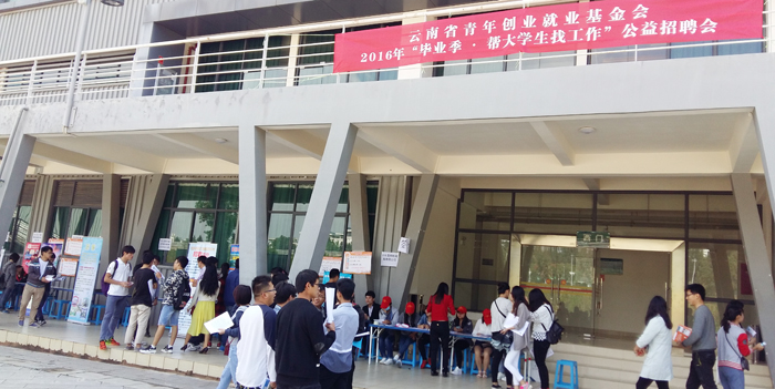 5月27日,由云南省青年创业就业基金会、yl23411永利集团官网招生就业处、云南招聘网主办,yl23411永利集团官网青年益工社承办的“2016毕业季•帮大学生找工作”大型公益招聘会在永利官网体育馆综合馆场外成功举办。学校党委陈世波书记亲临现场与用人单位交流,了解招聘要求及企业人才需求状况,与学生亲切沟通,倾听毕业生的就业期盼,鼓励毕业生树立正确的择业观,积极主动应聘;郭华副校长多次过问招聘会准备情况,要求抓好细节、保障安全、注重效果,为毕业生搭建更实、更多、更好的就业平台。学校招生就业处和各院系分管就业创业工作的领导、辅导员也到招聘会现场了解招聘情况。
