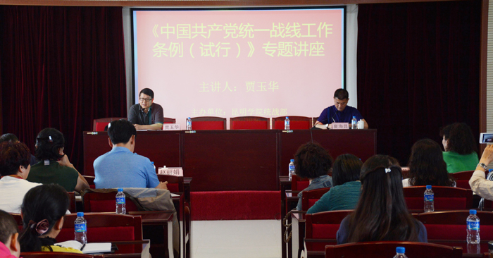 官渡区委统战部副部长夏海昆主持学习贯彻《中国共产党统一战线工作条例(试行)》专题讲座。市委统战部副部长、市侨联党组书记贾玉华作专题辅导。他全面讲述了《条例》出台的历史背景、时代特征与时代基础和重大意义,从理论的高度阐述了《条例》的新思想、新观点、新论述,强调《条例》是做好新形势下统战工作的理论武装、根本遵行和行动指南,是党的统战工作更加制度化和规范化的准则;“党要管党、从严治党”是《条例》重要原则之一,要求全体人员要充分认识统战工作的重要性和紧迫性,深刻理解“统”字的丰富内涵,坚持和而不同、尊重包容差异,正确处理一致性和多样性的关系,把握新形势下统战工作的范围和对象,统战工作的内容和方法,不断提升统战工作的能力和素质。
