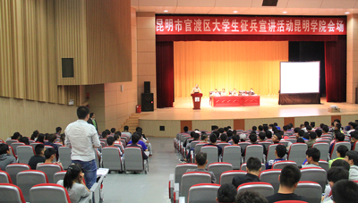 5月19日下午,永利官网联合昆明市官渡区武装部在学生会堂共同举行2016年大学生征兵yl23411永利集团官网专场宣讲活动,并向学生提供征兵现场咨询服务。官渡区武装部部长李斌、副部长李智勇、yl23411永利集团官网武装部副部长吴向东出席宣讲活动。来自永利官网各院系的学生代表1200余人参加了宣讲活动,宣讲活动由吴向东副部长主持。