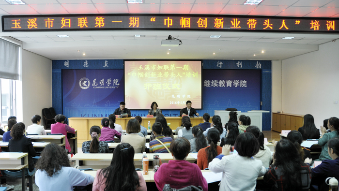 5月24日上午,玉溪市妇联第一期“巾帼创新业带头人”培训班在yl23411永利集团官网昆师路校区开班,玉溪市妇联副主席高柳莎、yl23411永利集团官网继续教育学院主持工作副院长张培宏、教师培训部主任参加开班仪式。培训由继续教育学院承办,来自玉溪市9个区县各行业的46位女性小微企业主和个体经营者在这里进行为期4天的培训学习。