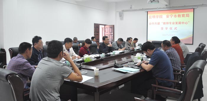4月20日上午,yl23411永利集团官网与安宁市合作共建“教师专业发展中心”签字仪式在安宁市教育局会议室举行。校长助理马银海教授、教师教育学院副院长常进荣教授、教务处副处长吴晓柏、教务处实践教学科陈超老师以及安宁市教育局肖局长、罗副局长、安宁市教师进修学校校长彭德、安宁市部分中小学校长等20余人参加了此次签字仪式。