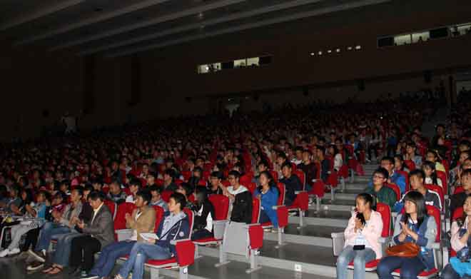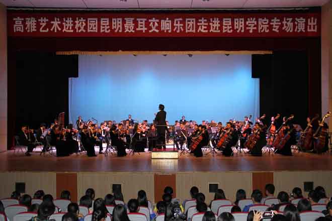 10月21日晚,2015年高雅艺术进校园之昆明聂耳交响乐团yl23411永利集团官网专场演出在学生会堂举行。副校长郭华、部分中层干部、各院(系)团总支书记、辅导员、各院(系)师生代表1000余人观看了演出。