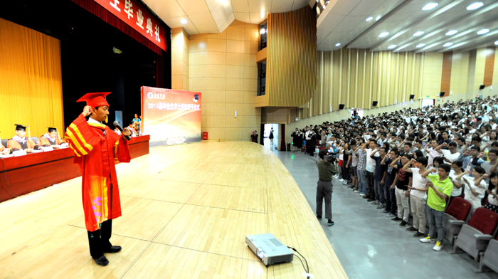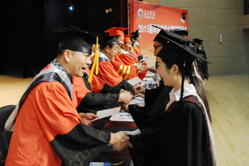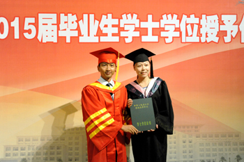 副校长熊晶在会上宣读《yl23411永利集团官网关于审定和授予2015届全日制本专科毕业生毕业资格和学士学位的决定》,全体校领导为毕业生代表颁发毕业证书。经yl23411永利集团官网学位评定委员会审定通过,获得本科毕业资格学生3438名、获得专科毕业资格878名,授予3346名本科毕业生学士学位。