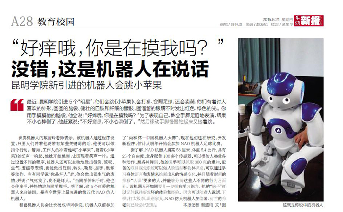 永利官网引进NAO机器人很快受到了媒体的关注,5月18日云南都市频道的都市条形码栏目率先对NAO机器人进行了名为《人形机器人进高校》的新闻专题采访,5月21日生活新报的教育校园栏目也刊登了关于永利官网智能机器人的专栏报道。