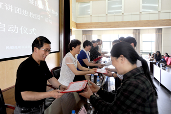 夏静在启动仪式上讲话,她指出,民盟昆明市委法律宣讲团进校园活动是民盟法律志愿者服务的一项重要内容,通过与yl23411永利集团官网联合举办“法律讲堂”,以学校优秀教师组成的法律讲师团和具有丰富法律工作实践经验的盟员律师组成的法律宣讲团,根据法律普及的新要求,针对师生的法律需求,定期开展法律讲座,普及法律知识,提供法律援助。夏静表示,只有全社会都做到尊法学法守法用法,法治才能成为中国梦实现的坚强保障。她还对宣讲团如何开展好法律服务提出了三点要求,一要站稳法律宣讲的政治立场;二要注重律师的职业操守;三要做足“法律讲堂”的功课,满足师生的法律需求。