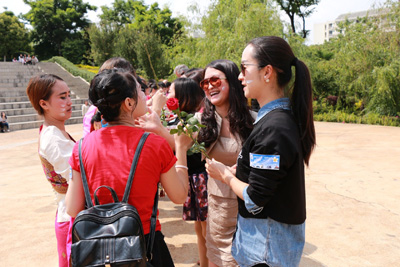 活动最后,老挝的留学生们邀请在座的师生们一起上台学跳老挝传统舞蹈,并将鲜花赠送给参与活动的老师们,祝老师们老挝新年快乐。活动在老师们为老挝学生泼洒祝福之水和互送祝福之语中圆满落幕。