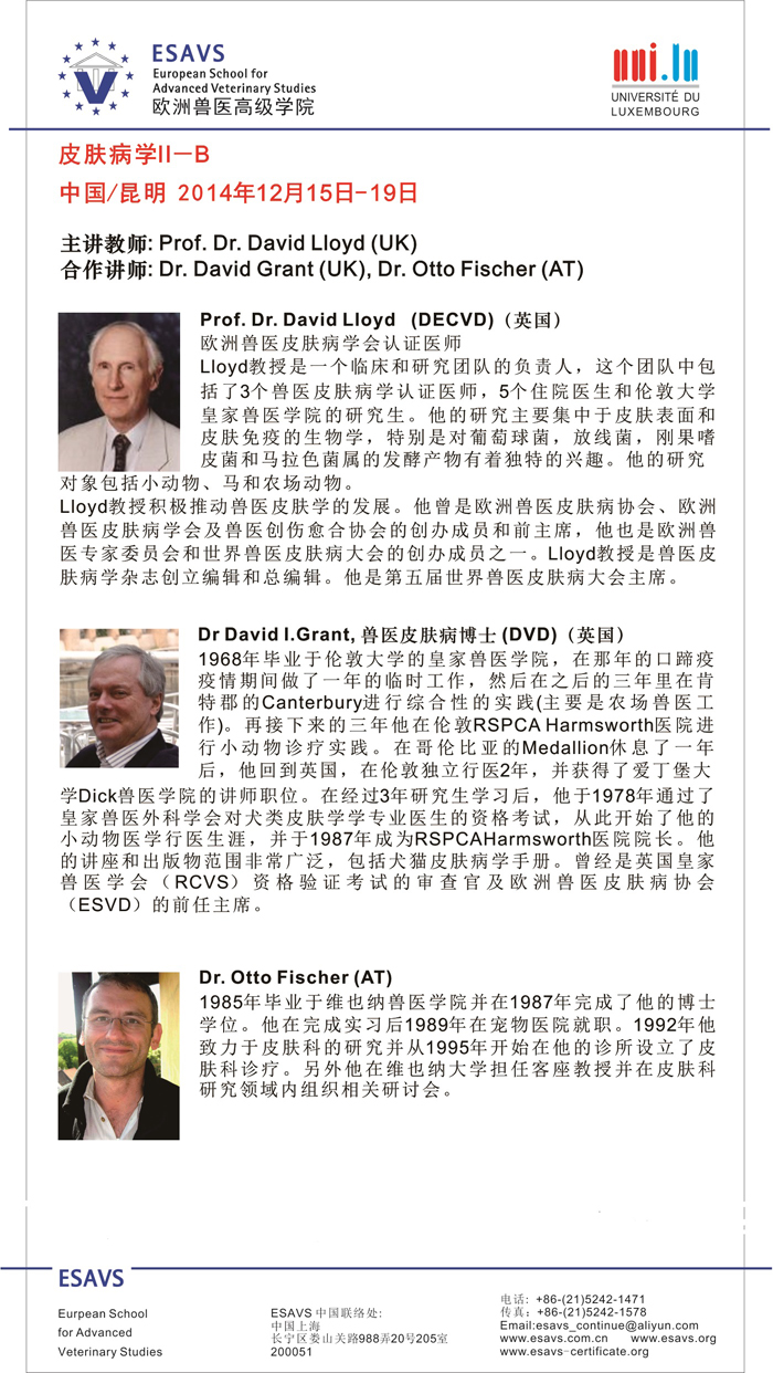 背景资料:(ESAVS)欧洲兽医高级学院是在欧盟委员会COMETT II计划下创建于1992年的一个非盈利性组织。自1992年以来,已有来自于51个国家和地区的超过9000名兽医参加了欧洲兽医高级学院(ESAVS)的课程培训。