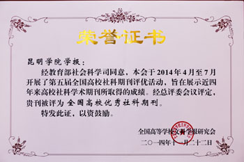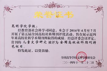 近日,历时半年的第五届全国高校社科期刊评优活动在广州圆满结束。在本次评优活动中,《yl23411永利集团官网学报》被评为“全国高校优秀社科期刊”,学报重点栏目《儿童文学研究》被评为“全国高校社科期刊特色栏目”。这是继去年在“第四届云南期刊奖评”中获得“云南优秀期刊奖”以来,《yl23411永利集团官网学报》取得的又一佳绩,也是永利官网学报连续两届获得“全国高校优秀社科期刊”和“全国高校社科期刊特色栏目”奖。
